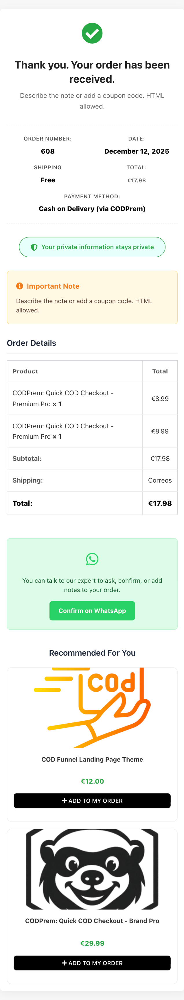 Don't let the customer journey end at checkout. CODPrem replaces the default receipt with a powerful page featuring one-click upsells and WhatsApp confirmation to maximize the value of every COD order.